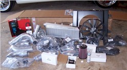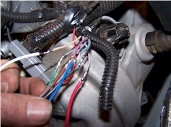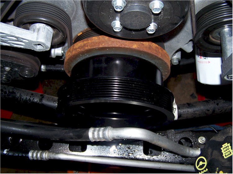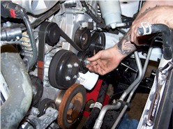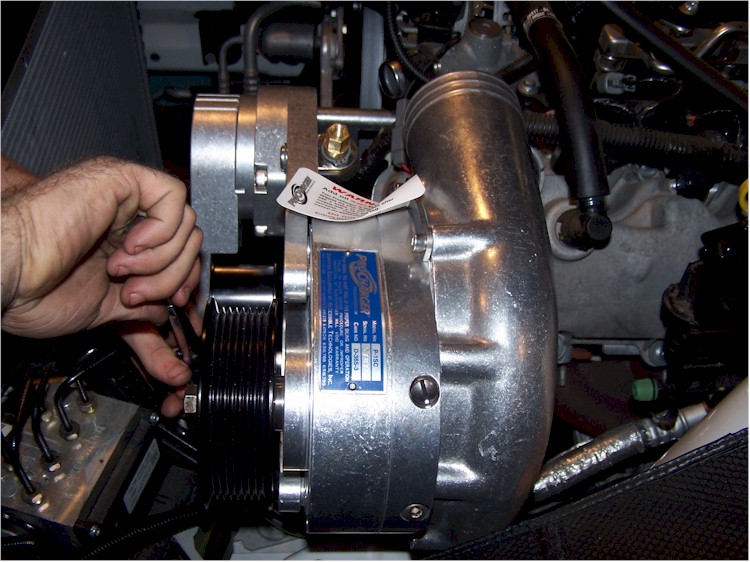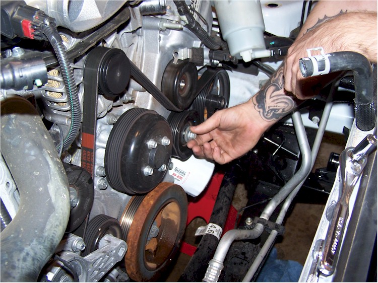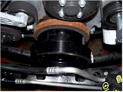 | We then attached the compressor to the bracket. The original crankshaft bolt had to be removed to install the supercharger drive pulley. We tried to break the crankshaft bolt loose with a 1/2" air impact, but it wouldn't budge it. We ended up jamming a ratchet handle through the spokes of the power steering pump to keep the engine from spinning and then we broke the bolt loose with a break over handle. Procharger provides a longer crankshaft bolt to install the supercharger pulley with. The MAF sensor wires are too short to reach the new location of the MAF, so Procharger provided us with 6 different colored lengths of wire to extend the wires with. Be sure to match up all the colors before the soldering is done. |
