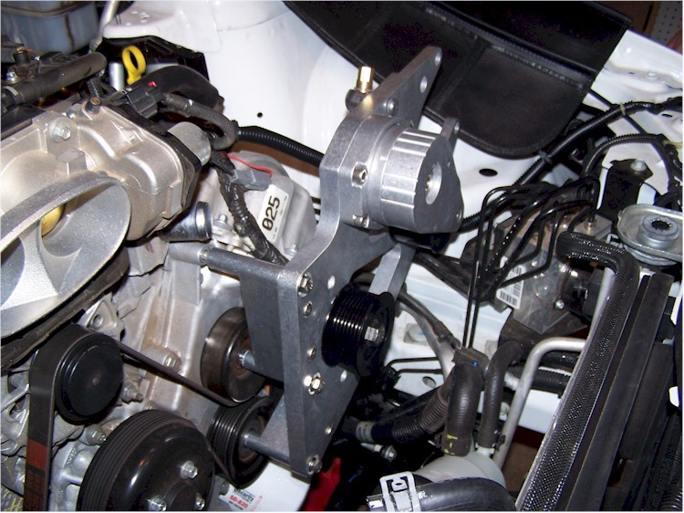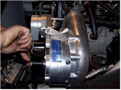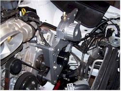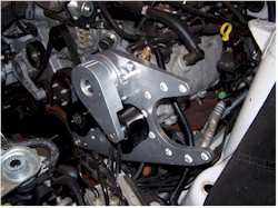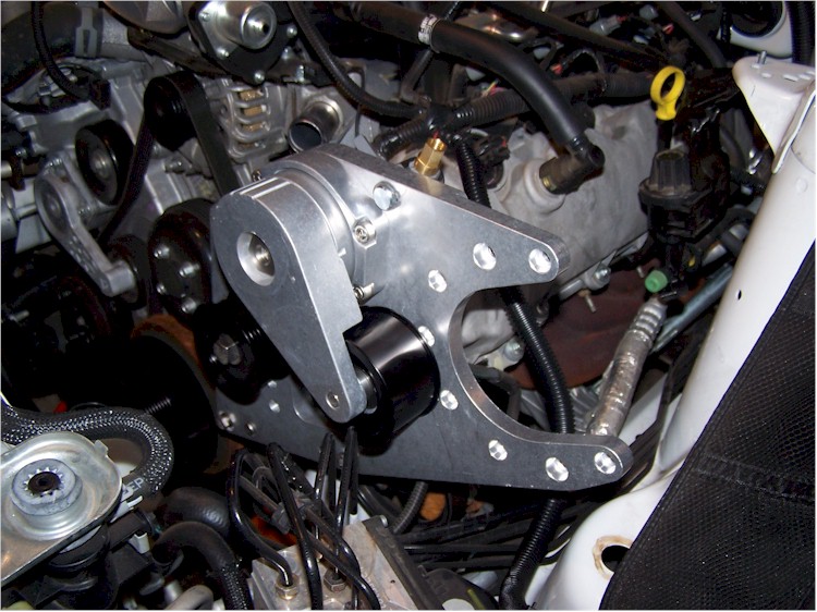 | After we removed the fan and fan shroud assembly, we had plenty of room to remove the factory idler pulley bolts. Do not remove the pulleys. The pulleys will stay in place with their bolts removed. Using Lock Tite on the main bracket bolts, attach the bracket to the front of the engine as shown in the pictures above. |